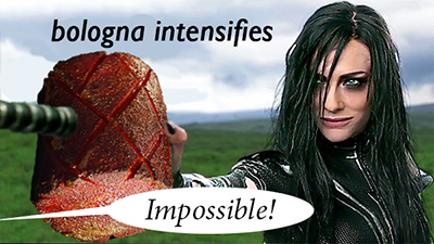 What—you can't bring your bologna sandwich along to the office? Now I'm curious about all the dumbasses who affirmed that bologna, like Thor's hammer, can't be lifted off a horizontal surface and carried somewhere else. Maybe Thor didn't need to go as far as Niưavellir to forge a Thanos-killing weapon: he could've sculpted one out of bologna, according to the pea-brains who think bologna is magically rooted to the earth's core.